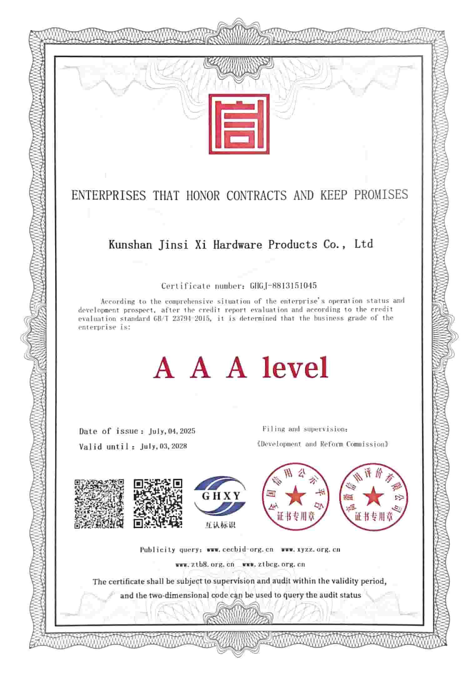 KunshanJINSIXISpoločnosť Metalware Co., Ltd. bola oficiálne ocenená titulom „Podniky na úrovni AAA, ktoré dodržujú zmluvy a dodržiavajú sľuby“. JINSIXI vždy dodržiavala obchodnú filozofiu „jednota a spolupráca, pracovitosť, snaha o dokonalosť a dokonalosť“, fungovala bezúhonne, poskytovala zákazníkom vysokokvalitné služby a v konečnom dôsledku dosahovala „dokonalé naplnenie“.